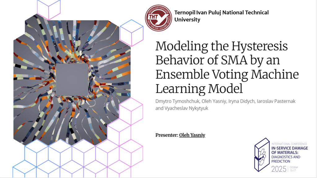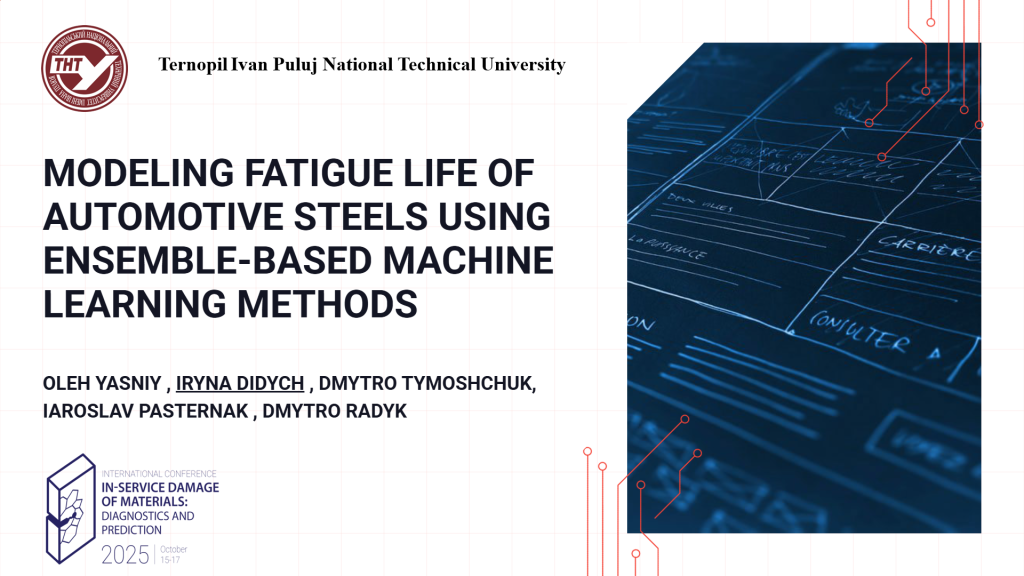 Доцентка кафедри КТ, PhD Ірина ДІДИЧ з колегами з ТНТУ також представили в рамках конференції наукове дослідження на тему : “Modeling fatigue life of automotive steels using ensemble-based machine learning methods” (Oleh Yasniy, Iryna Didych, Dmytro Tymoshchuk, Jaroslav Pasternak, Dmytro Radyk).